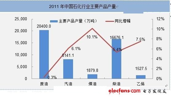 2011年全国原油产量20400万吨,同比增长0.3%;汽油产量8141.1万吨,同比增长6.1%:煤油产量1879.8万吨,同比增长10.1%;柴油产量16676.1万吨,同比增长5.4%:乙烯产量1527.5万吨,同比增长7.5%。