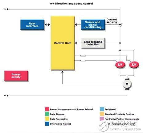 这类电机一般用于不需要连续运转模式的交流应用。 交流通用电机驱动电路采用相位角极化技术控制转速。 这种方法由改变加给电机的 RMS 电压组成。 这种情况下,电压是双向开关三极管(Triac)点火角的函数。 ACST 系列开关器件高换向能力可以快速改变点火角。 导通角 (α),即点火角,理论变量为0°至180°。 ST 提供广泛的产品选择,满足这种应用各方面的要求,帮助您实现高度可靠的稳定性目标。