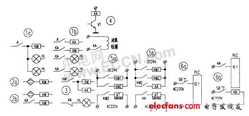 在工业控制线路控制线路中电压是DC24V。接触器KM2需控制电磁阀KT的通断,而电磁阀的线圈电压是AC220V。如果按照图5a所示的电路,将电磁阀的线圈直接与接触器的接点相接,在原理上不是不可以,但考虑到维修习惯和使用安全问题。应该在另一个地方安装一个中间继电器,通过中间继电器来控制电磁阀。如图5b所示。这样做可以将直流与交流、高压与低压分开.便于以后的维修并有利于安全使用。