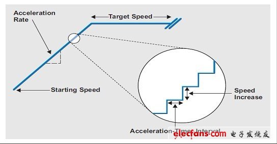 在马达启动前不久,便进行一次加速速率计算。负责该计算的软件,确定加速度定时器的时间间隔和增量因数大小,然后对各变量进行相应的配置。同时使用这些变量,直到对 SPS 速率的修改足以达到目标速度为止。一旦达到目标速度,加速终止。