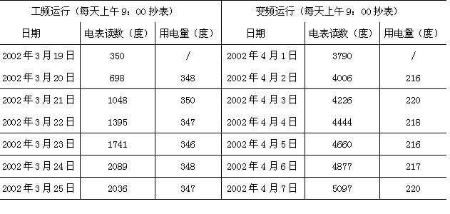 为了能直观体现变频改造后的节能效果,我们做了如下的测试:以1#日立机组冷却水泵14#(15KW)和K4风柜4#(22KW)为对象,在它们各自的主回路上加装电度表,先工频运行一星期,每天定时记录电表读数,再变频运行一星期,进行同样的工作,其数据如表1和表2所示。