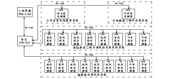 中央空调水泵风机变频监控系统的硬件结构图如图三所示,它由公司自来水恒压泵、分包装部二楼冷冻泵、质检部老二楼空调机房水泵风机和基因部水泵风机四个子系统组成,对分布在不同部门的19台变频器实施远程监控。各部分说明如下:①、变频器选用台达VFD-P系列变频器,该系列变频器具有高可靠性,低噪声,高节能,保护功能健全,内建功能强大的RS-485串行通讯接口,且RS-485串行通讯协议对用户公开等特点。②、PLC作为控制单元,是整个系统的控制核心,选用台达DVP24ES01R。运用其通讯指令编好程序,下载到PLC,然后将它与变频器的RS-485串行通讯接口相连接,就可实现与变频器的实时通讯。③、人机界面采用Hitech公司的PWS-3760,彩色10.4寸。它是新一代高科技可编程终端,专为PLC而设计的互动式工作站,具备与各品牌PLC连线监控能力,适于在恶劣的工业环境中应用,可代替普通或工控计算机。其主要特点有:画面容量大,可达255个画面,画面规划简单;使用ADP3全中文操作软件,适用于WINDOWS95/WINDOWS98环境,巨集指令丰富,编程简单;具有交互性好,抗干扰能力强,通讯可靠性高;自动化程度高,操作简单方便,故障率低,寿命长,维修量少。其主要功能有:设计者可依需要编辑出各种画面,实时显示设备状态或系统的操作指示信息;人机界面上的触摸按键可产生相应的开关信号,或输入数值、字符给PLC进行数据交换,从而产生相应的动作控制设备的运行;可多幅画面重叠或切换显示,显示文字、数字、图形、字符串、警报信息、动作流程、统计资料、历史记录、趋势图、简易报表等。④、RS-485串行通讯办法:RS-485采用平衡发送接收办法,它具有传输距离长、抗干扰能力强和多站能力的优点。