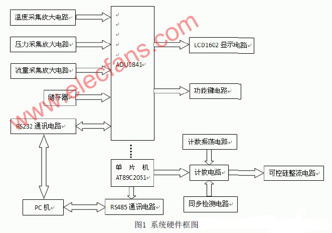 大体数据流程为各类传感器信号读入到ADUC841内并在存储器内暂存,同时将信息显示在LCD上。然后通过串口上行将数据上传到上位PC机。同时上位机将控制信息通过串口下行发送到AT89C051,它与同步、检测、技术电路相配合来触发可控硅控制电机转速。