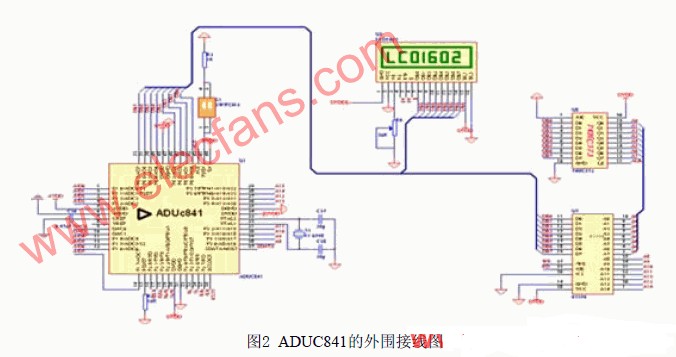 整个系统由ADUC841微控制器[3][4]、LCD显示电路、DAC输出电路、ADC采集电路、RS232通信电路等组成。主要对旋风筒内的温度,压力、空气流量等信号进行实时检测、并将数据与上传PC机的等功能。下图为ADUC841的接线图。从图上可看到总线连接方案为:采用线选方式与高密度存储芯片62256接驳,即P0作为地址线时首先接到八进制三态锁存器74HC573再连接到62256RAM的低8位地址线上,P2.0-P2.6直接与62256RAM的高7位地址线相连,同时P2.7连接片选信号以实现其0000H-7FFFFH空间的访问。与LCD及其MAX485的接驳则采用全译码方式,P2口的4,5,6脚作地址线时接到74LS138的ABC上,译码后用来控制液晶显示器显示与串口通讯。P0口的作数据线时直接和RAM与LCD的数据线连接。