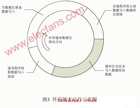 技术上主要使用VB的MsComm控件[10]将上位机的控制指令发往AT89c2051,同时将ADU841送来的检测数据信号读入。此处的难点是串口通讯程序与数据库存储程序之间的配合,经过多次测试后采用了环形链表缓冲区方案。即串口通讯程序在响应ComEvReceive事件[8]中将单片机传来数据的写入环形链表(节点同时标记时间戳)数据区尾部。同时定时器周期触发存储事件,通过ADO将环形链表数据区头部一定数量的节点数据写入到SQLServer2000数据库中的表,成功存入后清空其节点内容为串口程序写入新的上传数据腾出空间。见图4环形链表运行示意图。通过合理设置环形链表节点数、波特率和定时器事件间隔时间,使得在缓冲区内写入和读出清除两种操作的平均吞吐率保持一致即可。这样可以实现程序的高效运行,同时固定的缓冲储存区的方案较动态数组开辟空间方案更加稳定。