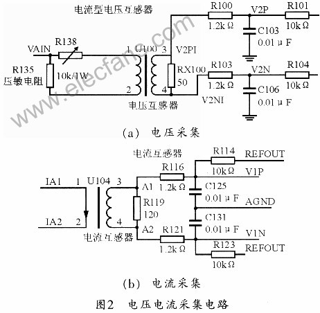 系统通过电压互感器和电流互感器后,可对采集到的用电设备的三相交流电压值,三相交流电流值进行处理,再送入ATT7022B芯片进行测量和计算。图2所示是本系统的电压和电流采集电路。