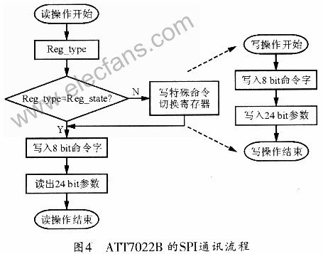 图4所示是基于ATT7022B的SPI通讯流程。本程序主要是完成ATT7022B的初始化工作。并根据LPC2132FBD64的查询命令向其发送数据或修改ATT7022B寄存器中的参数。如果遇到异常情况,则由终端自动向监控中心发报警信息。
