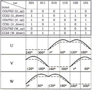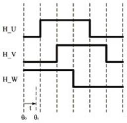 采用开关损耗最小正弦PWM控制BLDC时,电机端线电压与霍尔传感器输出之间的关系示意图如图6。