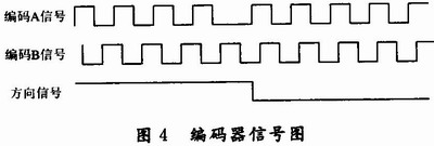 A、B两相信号是相位相差90°的正交方波脉冲串,每个脉冲代表被测对象旋转了一定的角度,A、B之间的相位关系则反映了被测对象的旋转方向。在FPGA中设计4倍频和鉴向电路,本设计采用2路输出:一路输出方向,另一路输出脉冲,并对鉴向倍频电路进行仿真,如图5所示。