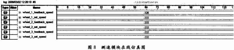 一种高效的硬件测试手段和系统测试方法,它能够获取并显示可编程片上系统(SOPC)的实时信号,它可以随设计文件一起下载到FPGA中,用于捕捉FPGA内部节点和I/0引脚的状态,就如同使用真的逻辑分析仪一样,对设计进行在线仿真,但又不影响硬件系统的工作。为了检验测得的全向轮实际速度值是否准确,对设计的测速模块进行了在线仿真。设定每个全向轮以固定的速度转动,对比测得的实际速度值和设定的速度值,如图8所示。