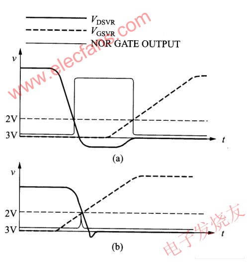 VF关断电路中的与门更多的作用如VR开启控制电路中的或门,给一个命令到计数器,以直接令计数器向上或向下记数。在VF的关断电路的情况,一个高电平从与门直达计数器以便在下个周期中向上记数。当计数器为下个周期增加一个记数值,则PWM控制器的下降沿与VF的栅源电压之间的延迟就会增加,从与门的输出脉冲就会变窄,这个反馈影响将持续到VF的栅源电压和VR的漏源电压能够同步。当延迟最佳化时,波形示于图7(b)。