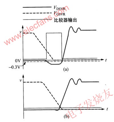 在通道导通期间,源漏电压大约等于I LOAD*.RDS(ON),并规定了噪声。比较器阈值设置在大约-300mV。比较器比较VR的源漏电压与此设置阈值,从比较器出来的高电平指示给控制器,系体二极管在导通,延迟时间需要增加,这与开启局面精确对应。因为关断延迟记数设置在起始时全部为0。图4(a)和(b)示出VR关断波形及比较器的输出。