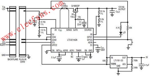 LTC4215-1 是一款用于热插拔电路的智能型电源卡。它提供了故障隔离,严密地监视电源通路的运状况,并实现了前所未有的浪涌电流控制水平。三通用的 I/O 引脚和一个备用的 ADC 通道可进一地控制电源通路和系统初始化 / 停机相关功能。