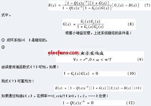 Q(z)、G,(。)为低通滤波补偿器,是重复控制器设计工作的重点。P( )的作用是将开环增益调节至很大的有限值,在不影响稳态精度的前提下保证系统稳定性;G,( )的作用是通过限制重复控制器的频带范围来提高系统的鲁棒性 。由图可得到系统的误差传递函数为: