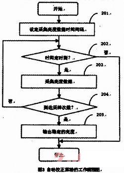 亮度感应自动控制的自动校正算法的步骤:首先设定采集亮度数据的时间间隔以及设定采样次数;当时间间隔定时到时,读取光感应器亮度的数据;当采样次数到达预设次数后,输出稳定的亮度;再由CPU输出稳定的PWM,去控制液晶面板的背光。设定采集亮度数据时间间隔201是初始化每次采集光感应器亮度的时间。时间定时到202是达到可以去采集光感应器亮度的时间。采集亮度数据203是CPU读取光感应器亮度数据通过ADC的数字信号的数值。到达采样次数204是到达采集亮度数据都一样的次数,表示环境亮度已经稳定,不再变化。输出稳定的亮度205是CPU输出稳定的PWM去控制液晶面板的背光。如图3亮度感应自动控制的自动校正算法的工作流程所示。