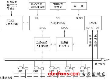 用户所需的生活用水压力、消防用水压力、运行方式等参数在TD200文本显示器上设定,压力传感器把用户管网压力转换为0-10V标准信号送进PLC模拟量模块EM235,PLC通过采样程序及PID闭环程序与用户设定压力构成闭环,运算后转换为PLC模拟量输出信号送给变频器,调节水泵电机转速,达到恒压供水的目的。