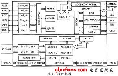 设计采用Altera公司的SOPC开发工具,系统的开发包括硬件和软件两大部分,使用SOPC Builder生成NIOS,NIOSⅡ嵌入式处理器。NIOS,NIOSⅡ嵌入式处理器开发工具允许用户配置一个或多个NIOS,NIOSⅡCPU,从标准库中添加外围设备,综合处理自定义系统,与QuartusⅡ设计软件一起编译系统。硬件框图如图1所示。