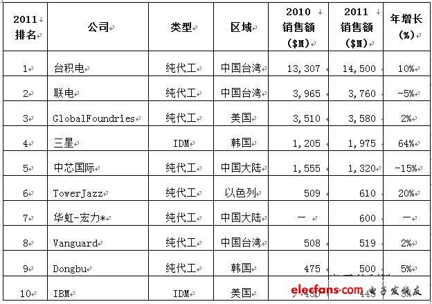 位列全球半导体产业第二的三星半导体,则高调宣布进军代工产业。2011年,在其苹果订单的支持下,三星的代工销售额接近20亿美元,名列代工排行榜第四。