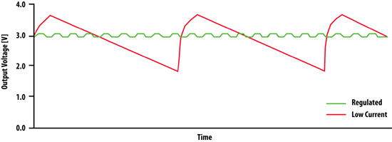 图3. 本图所示为一个升压转换器在不同负载下的典型输出电压曲线。在轻载或空载时(绿色曲线),测得的转换时间(上升电压)为数百微秒,而闲置时间(下降电压)为数秒。要注意的是这种变化是发生在MCU处于省电模式或功耗极小时。在主要工作模式,即有源调节模式下,输出电压仍保持稳定(3V +/- 100mV)(红色曲线)。