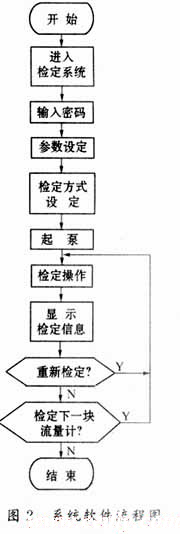 选择该种工作方式时,应先将控制室操作面板和泵房内电器控制柜上的“自动/手动”转换器打到手动工作状态,参数设置同上。根据被检表量程人为判断起动哪一台泵:首先,在电器控制柜上将要起动泵输出旋钮合上,点动变频柜上的变频器起动钮,泵起动后可通过调节操作面板或电器控制柜上的电位器旋钮来实现流量的调节。现场和控制室手动对流量调节的异地操作通过操作面板上“控制室频率调节现场”旋钮来实现。软件流程图见图2
