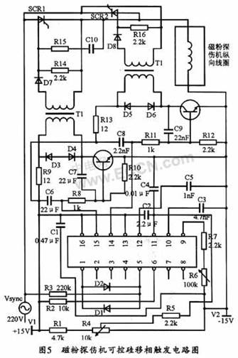 车轮轮对荧光磁粉探伤机的可控硅移相触发电路如图5所示。该电路应用TCA785输出的Q1和02 (即14、15脚的输出)脉冲分别在交流电源的正负半周来直接触发晶闸管,移相控制电压U11来自外接的直流电源V1(此处用+15 V),在其有效范围内(0.2 V~V1-2 V)内连续变化时,脉冲输出Q1和Q2的相位即可在0°~180°范围内移相。
