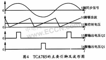TCA785的主要引脚波形如图4所示。其中5脚为外界同步信号端,用于检测交流电压过零点。10脚为片内产生的同步锯齿波,其斜坡最大及最小值由9、10两脚的外界电阻与电容决定。通过与11脚的控制电压相比较,可在15和14脚输出同步的脉冲信号,因此,改变11脚的控制电压,就可以实现移相控制。脉冲的宽度则由12脚的外接电容值决定,当选择双窄脉冲的驱动方式时,12脚应接150pF电容。实际上,有几十个微秒的脉冲宽度即可使晶闸管正常导通。