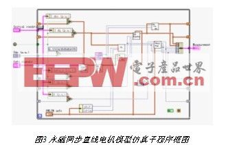 直线电机模型仿真模块:采用直线电机数学模型和运动方程来模拟实际直线电机的运行状态,把得到的直线电机各项运行数据送到直线电机控制器仿真模块。根据参数设置模块获得的直线电机参数,进行归一化处理,得到直线电机归一化参数。采集由直线电机控制器仿真模块发来的6路PWM信号(采用高速数字采集卡9401),结合直流母线电压和当前直线电机相电流正、负方向信号,计算出直线电机三相相电压,进行Clarke-Park变换,得到dq轴电压。然后根据归一化的直线电机dq轴方程计算出下一步直线电机dq轴电流、三相相电流、电磁推力。根据直线电机运动方程计算直线电机的加速度、速度、位移、电角度等信号,通过高速模拟输出卡9264,把上面计算出的两路相电流、速度、位移、电角度共5路信号送到直线电机控制器仿真模块。这部分子程序是在cRIO9004(内插9401和9264)的FPGA中开发成功。该模块的子程序框图如图3所示。