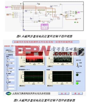 直线电机控制器仿真模块:该模块包含位置环、速度环、电流环三环和速度环、电流环二环闭环控制两个子程序,实现对模拟的直线电机进行速度或位置的闭环控制功能。以位置环闭环控制为例,来说明该模块的主要功能。采用9215和9205模拟采集卡采集到直线电机模型仿真模块发来的直线电机位置、电角速度、两路直线电机相电流和速度信号。根据位置给定信号和采集到的位置反馈信号,求出偏差值送入位置环PI调节器,其输出作为速度给定信号。以此类推,经过速度环PI调节器、电流环PI调节器(含d、q轴)得到d、q轴给定电压信号,通过Clarke-Park逆变换,得到三相相电压调制信号。这些信号与三角载波信号进行比较,得到包括正、反6路PWM信号(算法考虑了死区效应,防止逆变器上、下桥臂短路),通过9401高速数据采集卡输出到直线电机模型仿真模块,至此整个直线电机位置闭环控制得以实现。这部分子程序是在cRIO9074(内插9401、9205和9215)的FPGA中开发成功。位置环子程序程序框图和前面板图分别如图4、5所示。