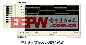 图8给出了直线电机仿真器中的PWM波形图。图中可以明显看出三对正、反相PWM波形的上下沿之间有死区延时,这样可以避免逆变器上下桥臂中的IGBT同时导通,造成逆变器输出电源正、负极短路危险。