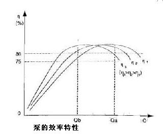 将这两种方法相比较可见,在流量相同的情况下,转速控制避免了阀门控制下因压头的升高和管阻增大所带来的能量损失。在流量减小时,转速控制使压头反而大幅度降低,所以它只需要一个比阀门控制小得多的,得以充分利用的功率损耗。泵的效率特性曲线η-Q,如图3所示。随着转速的降低,泵的高效率区段将向左方移动。这说明,转速控制方式在低速小流量时,仍可使泵机高效率运行。
