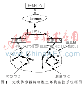 传感器网络节点由传感器测量节点、控制节点和汇聚节点组成。测量节点负责采集周围环境信息,采集的环境信息经多跳路由后到达汇聚节点,最终通过Internet到达控制中心。控制节点用来接收计算机传来的远程控制信息,对温室环境参数进行调控。