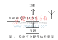 控制节点由驱动器模块、微处理器模块、无线通信模块和电源模块组成。驱动器模块能对调温、调湿等设备进行相关控制,其硬件结构框图如图3所示。