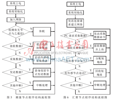 传感器测量节点的主要功能就是接收PC机采集数据的指令、采集数据,然后将采集的数据通过无线信道发送出去。汇聚节点的功能就是创建无线网络,配置网络节点属性,接收传感器测量节点采集的数据,然后通过串口上传到计算机。传感器测量节点程序结构流程图如图5所示,汇聚节点程序结构流程图如图6所示。