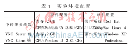 此改进方案已经应用于VcomOffice远程视频会议系统中。实验环境为:局域网内,中转服务器采用Linux操作系统,VNC Server和VNC Client端均采用Windows XP操作系统,具体的软硬件配置如表1所示。