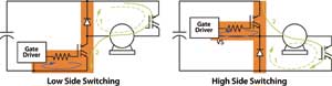 在图1中,电压源变频器的临界电流路径被标为红色阴影,其特征是di/dt变化率高,这个特征也表现在对应的栅极驱动电路上。要保证栅极驱动电路安全的工作,就要最大限度地减小杂散电感。尤其是高压侧栅极驱动电路,存在一个由低压侧二极管和电流通道上的阻性和感性压降所引起的,且幅度超过VS最小允许电压的负压,会导致电路工作异常。