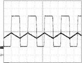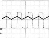 图 11: Vg=3.0V 时 L2 开关信号的电流波形。 1) VSW, 2V/div, DC; 2) 电感器电流,100mA/div, DC; T= ns/div