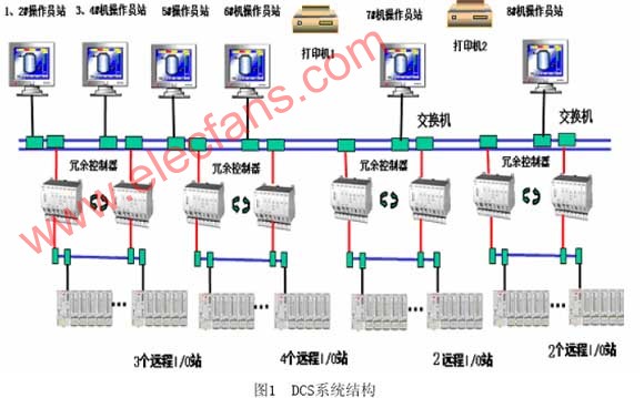 系统配备了四个过程站和八台操作员站:工程师站使用工控PC机(也可使用便携机)作为调试设备,按照煤化工艺和现场的布置图,我们共建立了4个过程站;系统操作员站运行在工业PC机上,基于MS Windows NT平台的全中文Digivis软件包开发的操作界面,其图形操作接口增强了系统的使用与操作功能。 此外,还可以提高PC机的外部设备指标如:显示器、打印机、鼠标及键盘等,使系统操作更方便。根据厂方要求对应四个过程站分别建立一个或两个操作员站,每个操作员站只可以监视和操作相应过程站的信息。具体结构如图1所示。