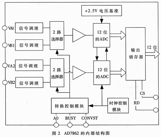 AD7862是AD公司推出的高速、低功耗、双极性12位的A/D转换芯片,其中包含了两个独立的快速ADC模块(允许同时采样和转换两路信号)、4路模拟输入信号(VAl、VA2、VBl、VB2)、2.5V的内部电压基准以及一个12位的高速并行接口。芯片正常运行时功耗只有60mW,当使用节电方式时,只有50μW,对于自带电源的USB设备这种低功耗无疑是一种优点。该芯片的内部结构如图2所示。每个ADC都有一个两通道的多路选择器,芯片通过地址信号A0分别选通VAl、VA2或VBl、VB2,当一个CONVST信号到来时,同时转换地址A0选中的两路信号。