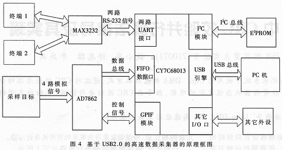 传统的高速数据采集卡一般都采用PCI总线设计,但是笔记本电脑以及大部分便携式设备是没有PCI插槽的。利用USB2.0技术,不仅保证了较高的数据传输率(传输率最大可以达到480Mbps),同时还具有便携和无需外加电源等优点。图4是系统的结构示意图。它的工作原理是:在GPIF模块的控制下,由AD7862对目标进行等间隔采样,然后将采样结果通过GPIF传送到CY7C68013的内部FIFO中缓存;当采集一定量的数据后,CY7C68013自动将数据打包(不需要8051的介入),通过USB总线传输到PC机中进行数据处理。由于有GPIF的硬件支持,CY7C68013中的8051内核只是在很少的时间内,对控制进行了辅助处理,大部分工作由GPIF硬件完成。这样8051还可以与其他外设进行互联等工作。在高速数据采集器上附加了两路RS-232接口,用于将GPS数据和高精度智能测深仪的数据中转到主控计算机上,大大方便了新近推出的笔记本电脑与传统外设之间的联系。因为新近推出的笔记本电脑大多不具有RS-232接口,而那些野外观测仪器大多只能通过RS-232接口进行数据交换。