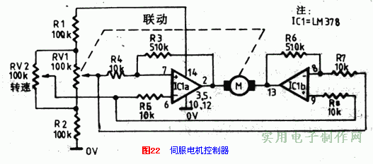 图22示出了伺服电机的最简单的应用。电位器RV1由伺服电机带动。电机可选用电流不超过700mA,电压为12~24V的任一种伺服电机。图中RV1和RV2是接成惠斯登(Wheatstone)电桥。集成电路LM378是双路4瓦功率放大器,也以桥接方式构成电机驱动差分放大器。