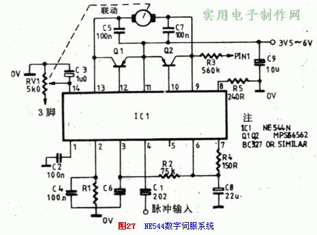 数字伺服电机控制单元,可以买到现成的集成电路。例如ZN409CE或NE544N型伺服电机放大器集成电路。图26和图27示出了这两种集成电路的典型应用。