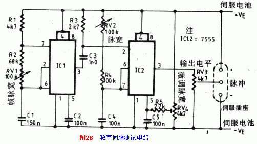 图28是适用上述伺服电机型的通用测试电路。伺服电源电池通常为5V。输入脉冲经标准的伺服插座送到伺服电路。帧脉冲的宽度为13—28ms;用RV1调节控制。RV2调节控制脉冲宽度在1—2ms之间。用RV4微调中间值为1.5ms.输出电平由RV3进行调节。