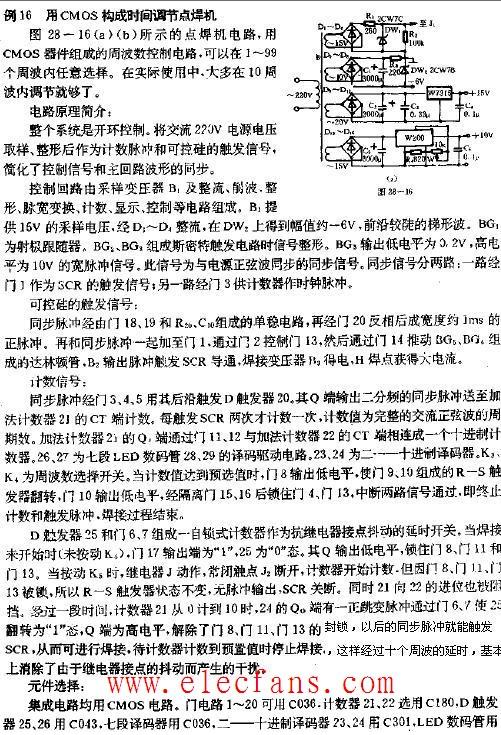CMOS构成的时间调节点焊机电路图,点焊机电路,用CMOS器件组成的周波数控制电路,可以在1-99个周波内任意选择.在实际使用中,大多在10周波内调节就可以了.