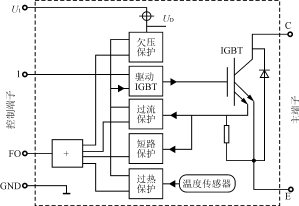 IPM系列产品的内部框图如图5所示。模块内部主要包括欠压保护电路、驱动IGBT的电路、过流保护电路、短路保护电路、温度传感器及过热保护电路、门电路和IGBT。该系列产品配16位单片机后构成的通用VVVF变频器的原理图,如图6所示。