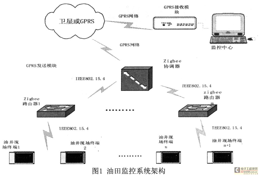 该系统分数据采集终端、Zi gBee无线路由器、ZigBee/WN协调器、控制中心四个部分。油田监测系统架构如图1示。 图一油田监控系统架构