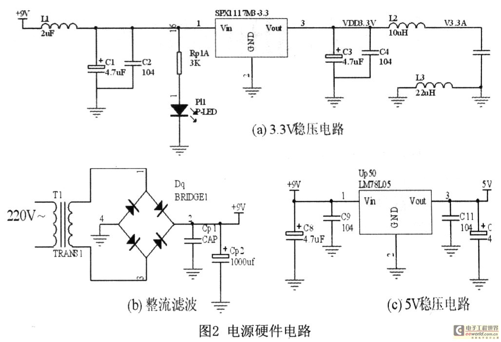 系统硬件由数据采集传感器、控制器、无线RF收发、存储、电源、GPRS接收、监控中心七个模块组成。传感器模块由载荷传感器、加速度传感器ADX105构成,功能是用来收集油井现场的示功信息;控制器模块为嵌入式系统ARM处理器,功能是进行数据的处理、功耗管理、同步定位、任务管理等操作;无线RF收发模块是由Phipcon公司开发的CC2420RF芯片,功能是与其他RF模块通信,传输油田现场的示功参数和控制信息;存储模块采用Samsung公司生产的NAND型FLASH存储器K9F2808UOC,容量为8~128MB,负责数据存储;电源模块分为两类:一类是高容量锂电池;另一类是变直之后的交流电源(硬件电路如图2所示)。GPRS收发模块A-232/485GPRSDTU负责GPRS通信链路的信息传递,将示功参数送至监控中心;监控中心模块负责数据收集、整理与分析,并反馈控制命令。