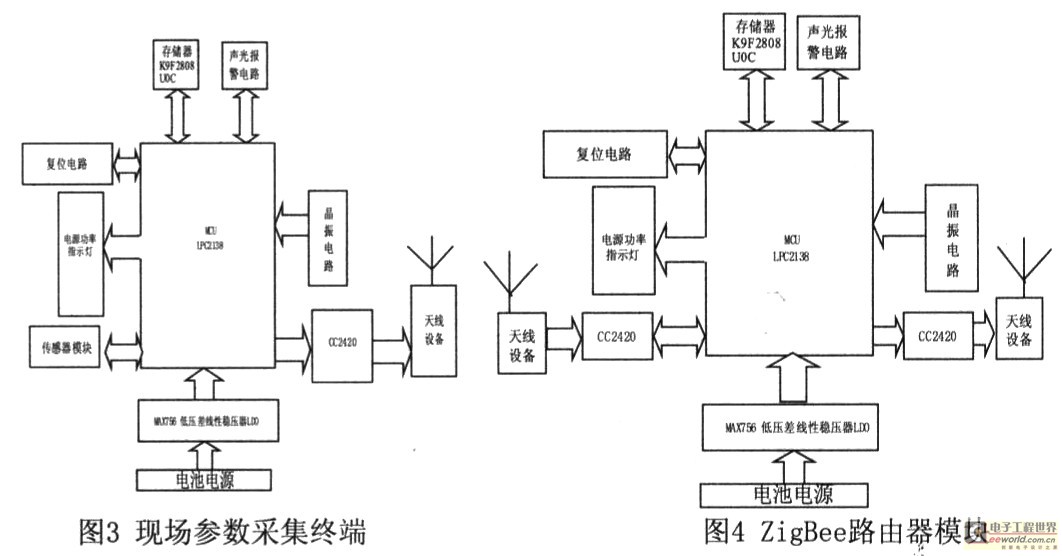采集终端(电路框图如图3所示),CC2420通过SPI总线连接到ARM芯片的P1.0~P1.7接口。高容量电池作为终端模块的电源,通过LD0低压差线性稳压器AM11 17-3.3为传感器模块、RF模块、MCU/ARM7提供3.3V左右电压。ARM芯片需3.0~3.6V(3.3V±10%),CC2420需2.0~3.6V。电源功率指示灯显示电源电压。声光报警单元对异常情况报警。晶振电路使ARM7与RF模块同步通信。ZigBee路由器模块框图如图4所示。