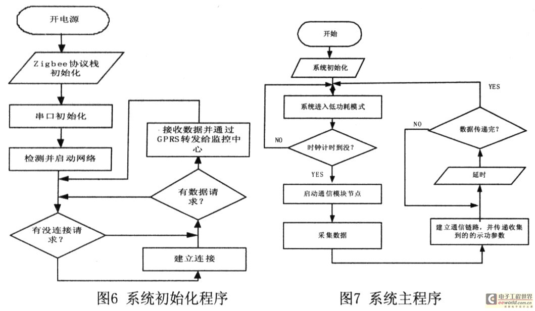 软件部分由监控中心、ZigBee协调器通信、ZigBee路由通信、数据采集终端ZigBeeRF模块中的收发模块通信、系统初始化程序(如图6所示)和信息采集终端等程序模块组成。