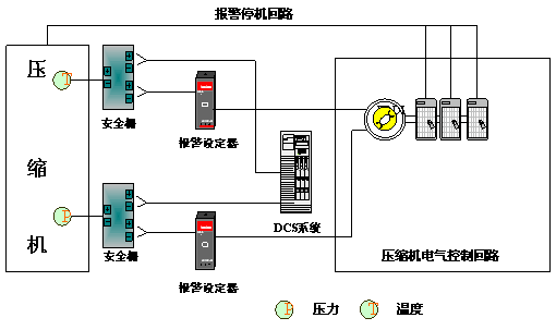 压缩机装置有30多个重要的生产参数,各生产参数相互牵制与影响。该装置对生产参数的要求较高,具体要求如下:进气压力<-0.05Mpa,排气压力>0.35Mpa,排气温度>85℃,机油压力<0.25Mpa,机油温度>65℃,必须进行声光报警,提醒操作人员及时处理,确保生产的安全;如果排气压力>0.45Mpa,排气温度>95℃,机油压力<0.15Mpa,机油温度>70℃,必须进行停机处理。将压缩机的生产参数如温度、压力等分为两路输入控制系统:一路引入报警设定器,报警设定器根据内部的参数设定的报警值,检测生产参数,如果生产参数异常,则发出故障报警信号,停止压缩机,保障设备、生产的安全;另一路引入DCS系统,进行参数的常规显示和流程画面,在发生故障或压缩机停机时,进行声光报警,提示操作人员,有效防止误操作,紧急排除险情。该系统提供历史数据浏览查询功能,可以对历史数据进行跟踪查询,为分析故障原因提供方便。整套系统相辅相成,界面友好直观,操作方便,既节省了人力资源,又提高了工作效率。