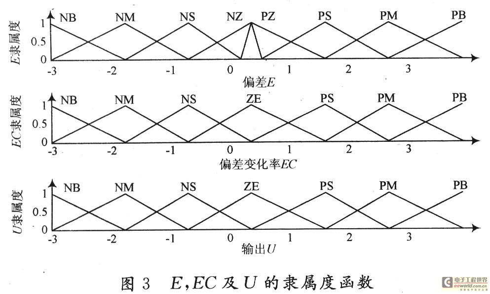 模糊控制器选用双输人单输出控制方式,以温度误差e和误差变化率ec作为输入变量,以u作为输出变量。模糊子集为E=EC=U={NB,NM,NS,ZE,PS,PM,PB}={负大,负中,负小,零,正小,正中,正大),其论域为:e=ec=u=[-3,3]={-3,-2,-1,0,1,2,3}。隶属度函数采用三角分布函数,如图3所示。